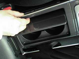 ~ カップホルダーパネルを外す(2) ~ カップホルダーのふたを開き、ふたの隙間に指を入れ、この写真の左角から少し力を入れて持ち上げる。 すると、ふた側のフックが外れる。 これで両側が外れるので、カップホルダーパネルが外れる。 |