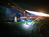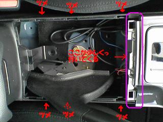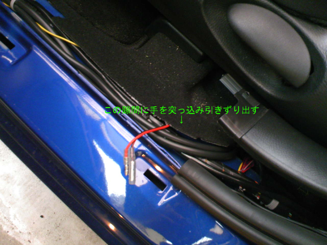 Bピラー下のマット隙間に手を突っ込み、差し込んだコードを引き出す。 これを運転席、助手席両方やる。 |