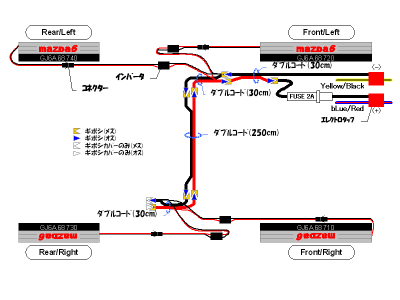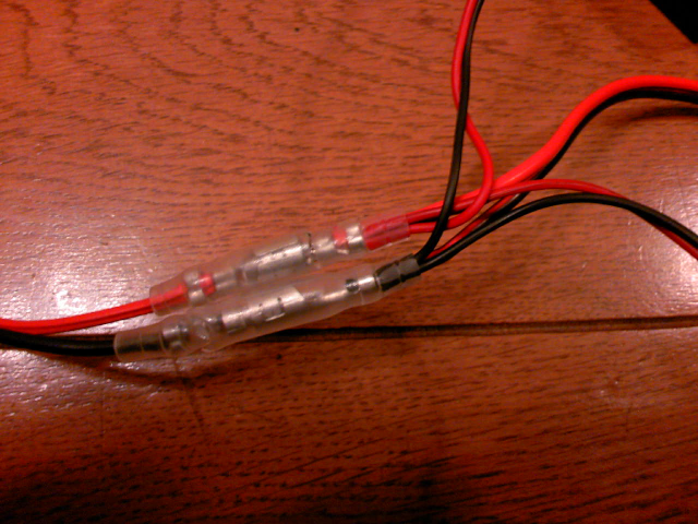 取り出した黄色に黒線のコードにダブルコードの黒を、青色に赤線のコードにヒューズの片方をエレクトロタップで結線する。 |