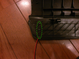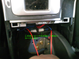後部座席から見た助手席と運転席下のマットの切れ目から手を突っ込み、埋め込んだコードをとりあえず引きずり出す。 ここまでうまくいったら、カップホルダーをはめ戻す。 再度コードをBピラー下方向に差込む。 |