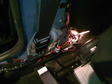助手席側左側、Bピラー下あたりの太いコードのテープを少し切ってはがす。 このコードから、黄色に黒線のコードと青色に赤線のコードを探す。 (←あ、バッテリー外してやっていない証拠写真。^^;) |