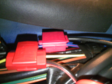 カップホルダー底から左右Bピラー下にバイパスするコードを通す。 助手席側と運転席側でギボシのオス・メスが違うので、方向を間違えないようにする。 適当に座席下にコードを埋め込む。次でこれを引き出す。 |