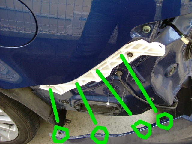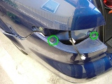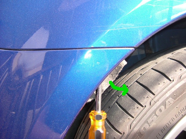 | リアタイヤの裏をめくり、バンパーの隅を止めているネジを外す。 |