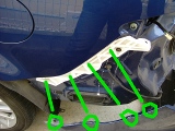 | バンパー下の左右2箇所ずつのファスナーを抜く。 |