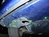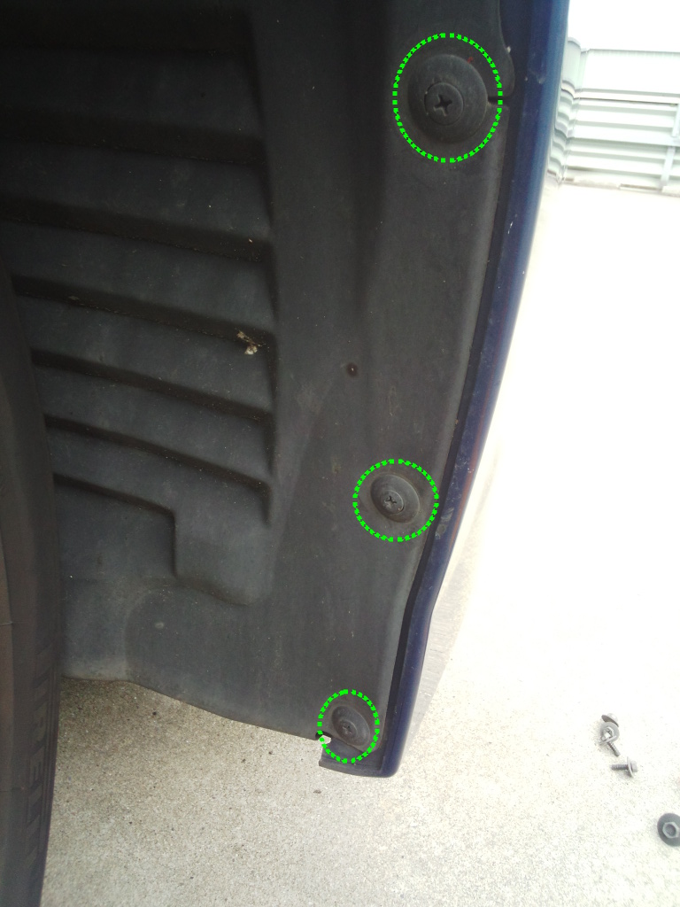 バンパー底の左右5本ずつ10本のビスを外す。 外側8本は8mm、内側2本は10mmのレンチで外す。 ちなみに外側はプラスドライバーが使える。 |