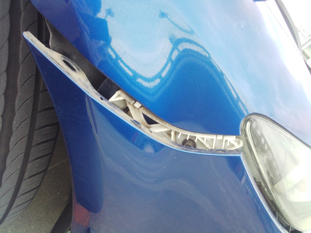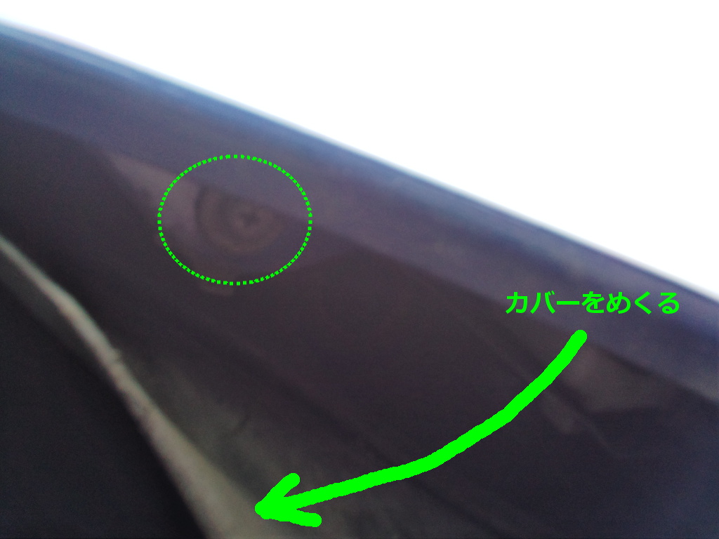 バンパーの両端を少しはがす。(数か所はめ込んである) バンパーでキズつけないよう、この部分に厚手の布を被せておく。 |