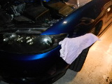もどすときも、バンパーでキズつけないよう、厚手の布を被せて作業をする。 ビスやファスナーを留め、もどし完了。 |
