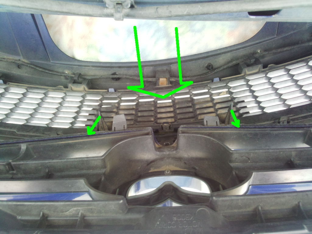 バンパー中央の2か所ツメを手探りで上に少し持ち上げ、バンパーを手前に引き抜く。 バンパーフォグ等のコードが接続された状態なので少し抜いた所で下す。 |