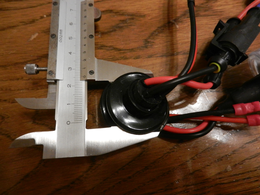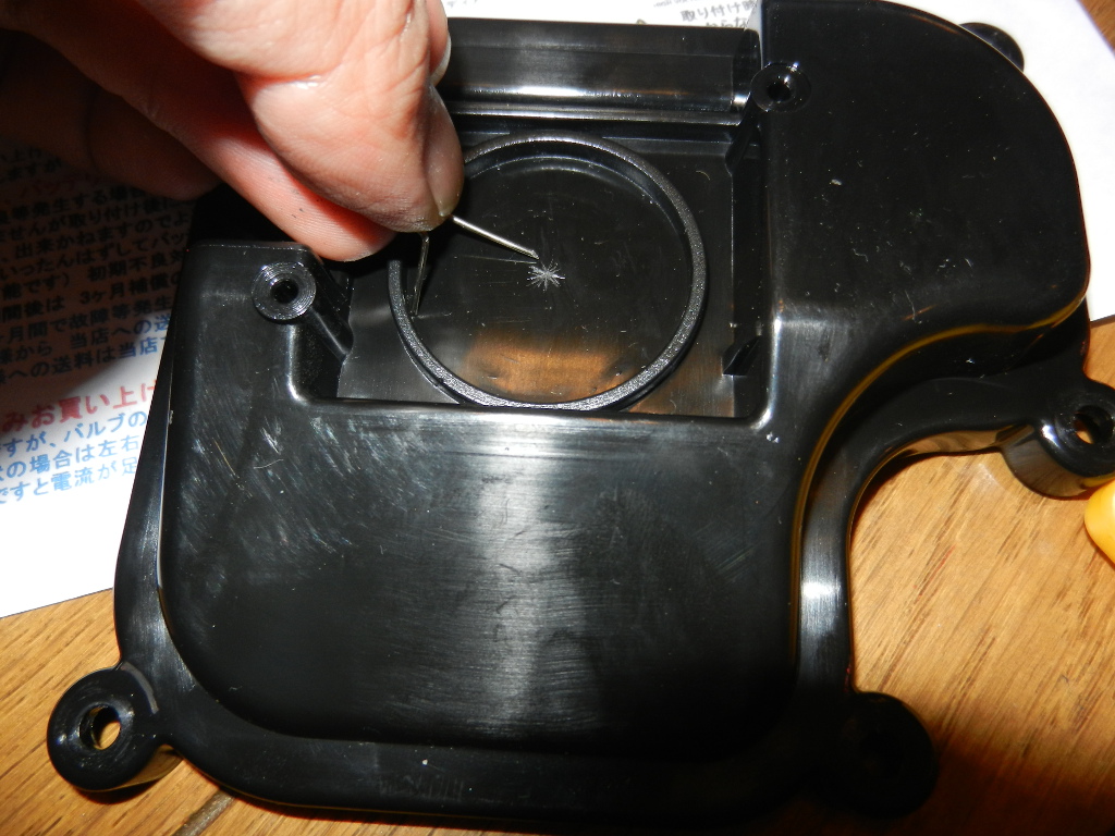 ロービームのフタに25mmの穴開け加工する。 中心を確認し、穴あけする。 この中心は慎重に決める必要がある。HIDのゴム部分がこのフタのマルにピッタリなので。 ホールソーがベストだが、高いし、この時夜中に作業していたこともあり、クリップで穴外形確認、ドリルと糸ノコで穴開け、ヤスリで微調整した。 |