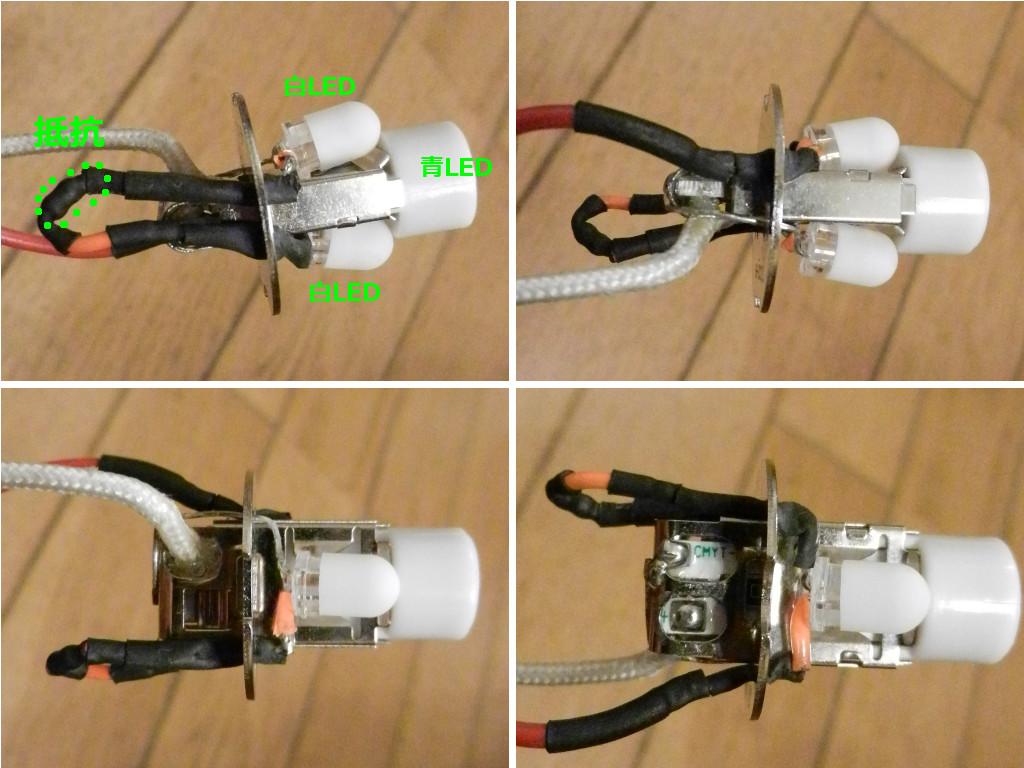 フォグ用H3ハロゲンをデイライト用のH3青LEDに変更する。青LEDだけではつまらないので、H3バルブを下記部品を使って白LEDで挟む加工をした。