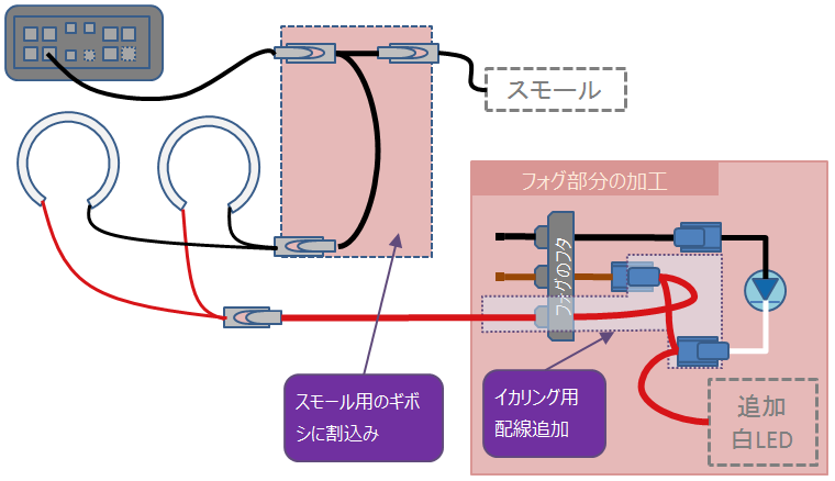 イカリングはコネクタに配線されていない。今回はデイライトとして使用するため、デイライト化するフォグのギボシとスモール用ギボシに配線を割り込ませる。 |