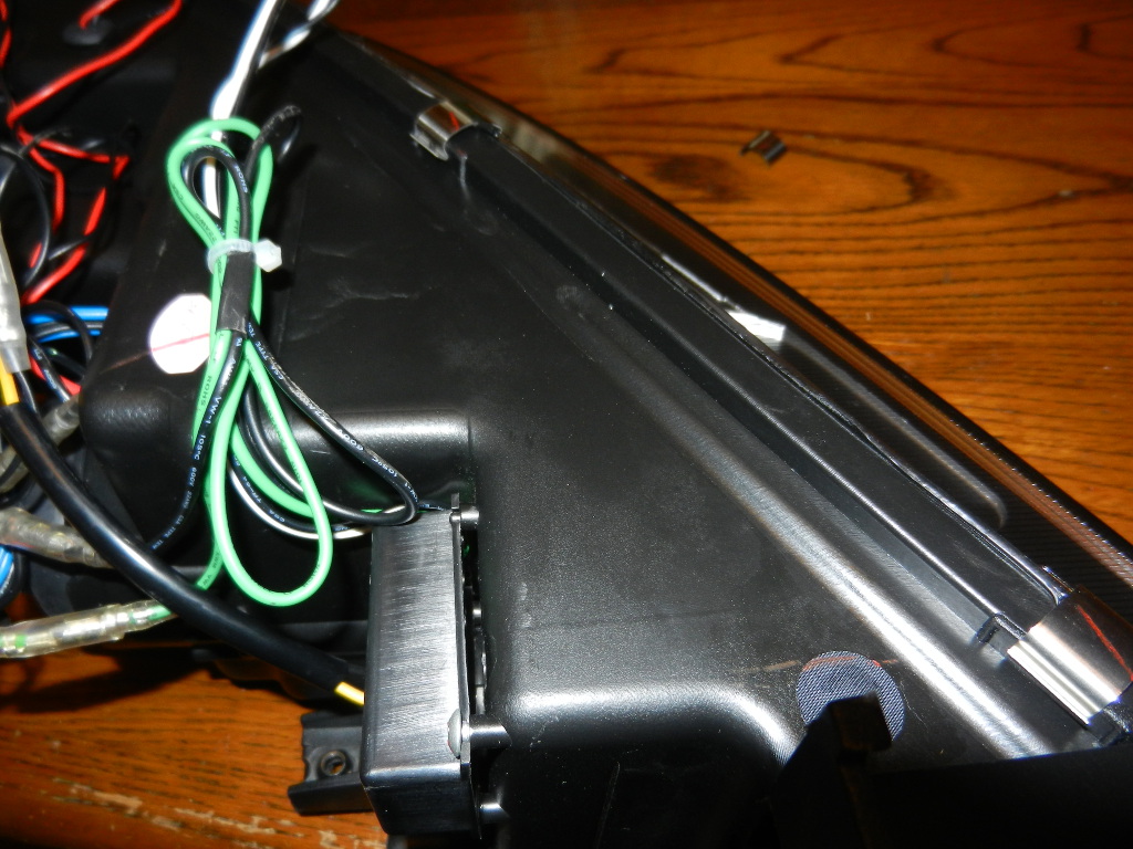純正ヘッドライトの下部にある部品をツメを広げながら外し、SONAR製ヘッドライトに取り付け後、車体にはめ込む。HIDのコネクターとヘッドライトのコネクターを接続し、各ライトが点灯することを確認する。 外したビスやファスナーを取り付ける。 |