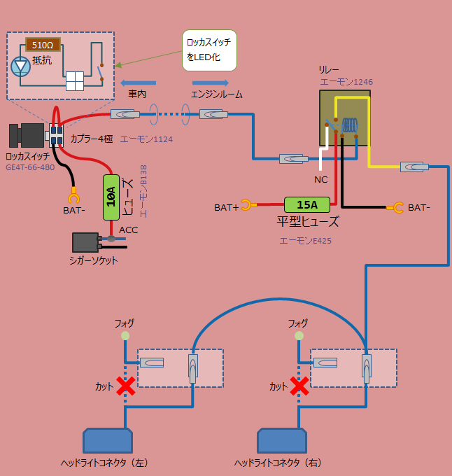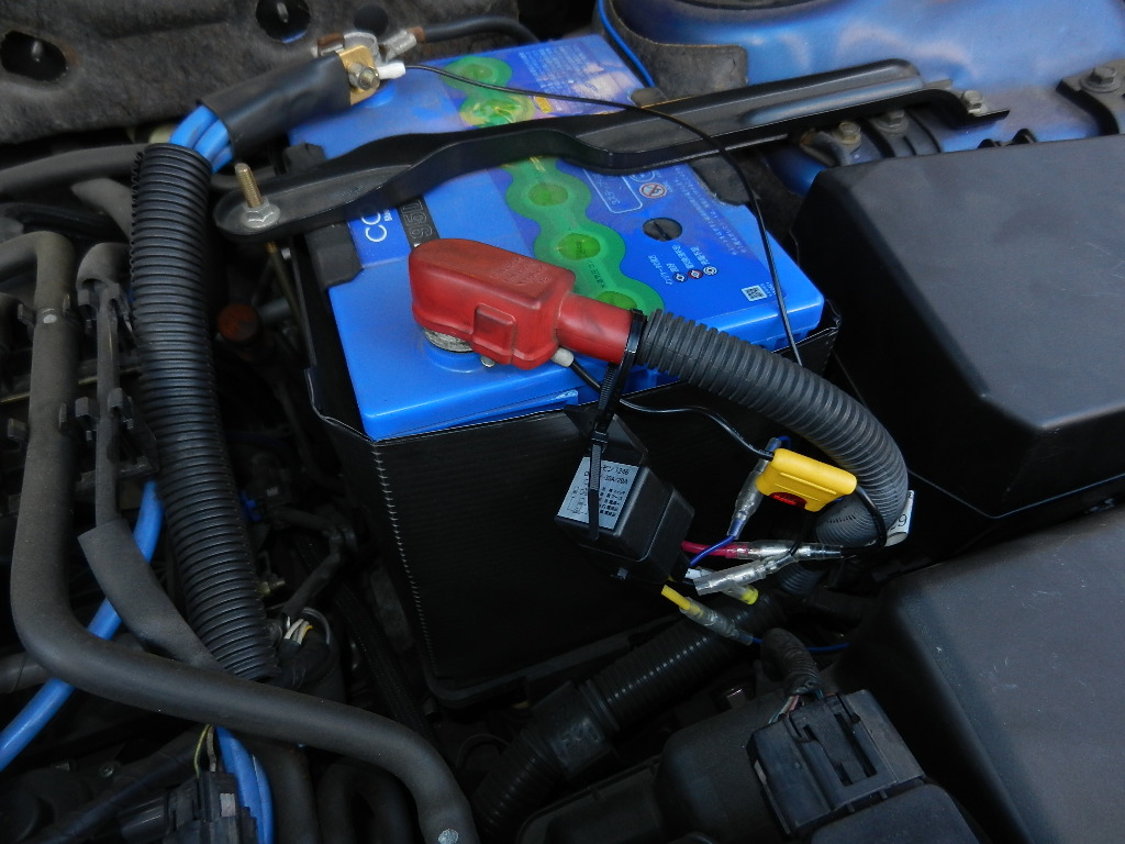 デイライト用の配線をする。 この配線は次の作業のバンパーおろしをしてからのほうが作業しやすい部分がある。