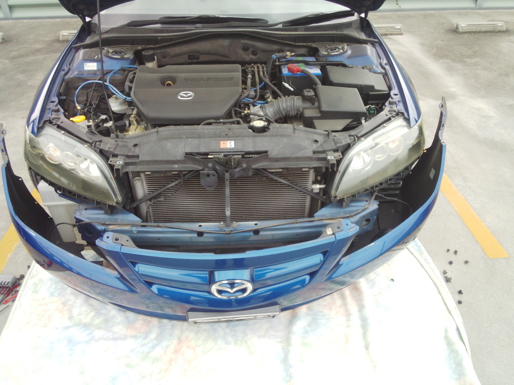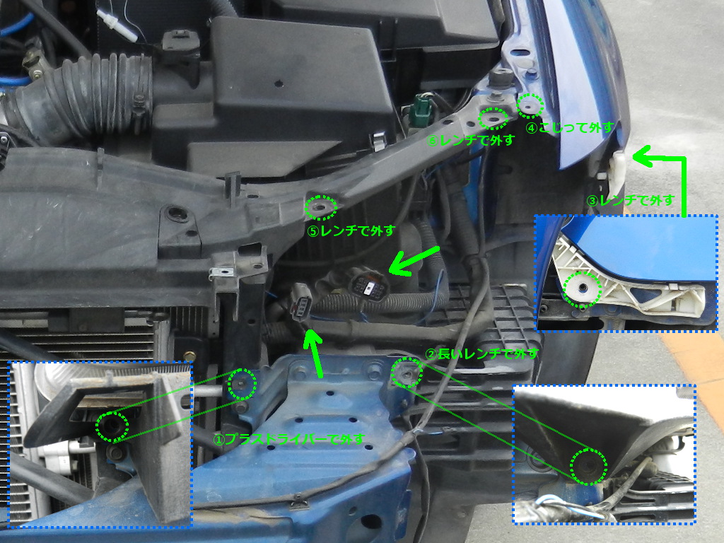 ヘッドライトを外すにはバンパーを外す必要がある。 外す手順はここ。 |