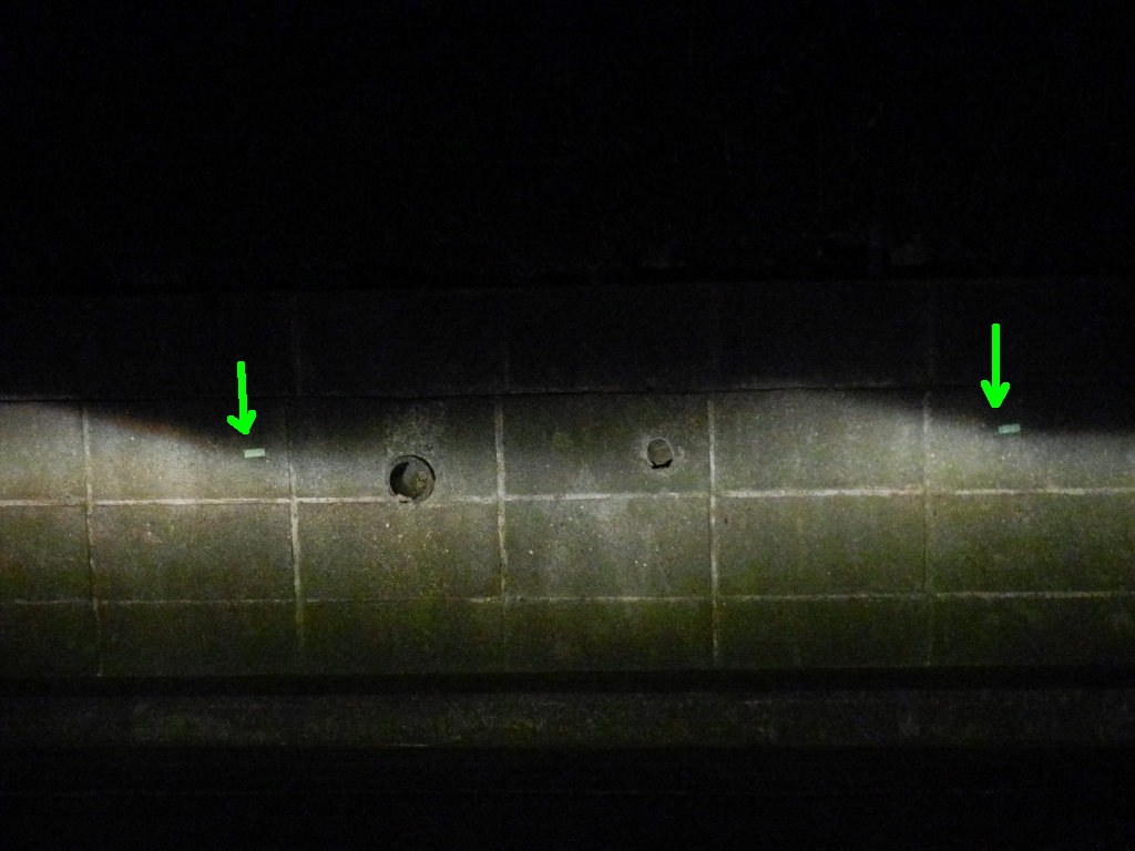 純正ヘッドライトのロビーム光軸を確認する。 左右とも左に上がり始めるところを確認しておく(養成テープ等で壁にマーク)。 ちなみに、フォグも光軸調整できる。今回はデイライトにするため何もせず。 |
