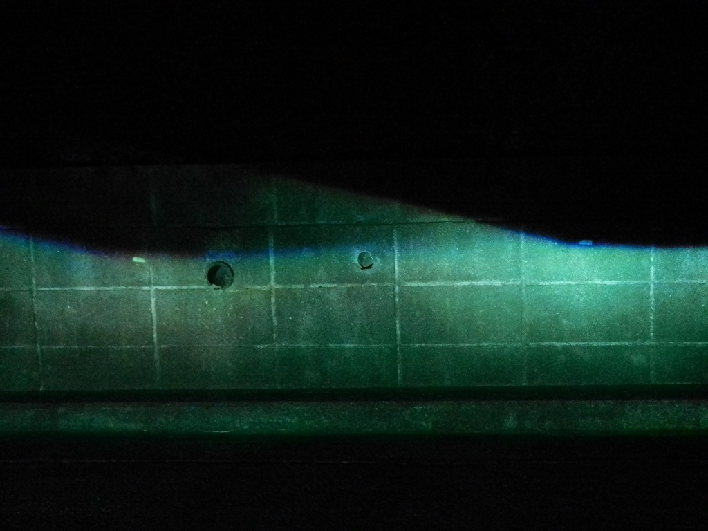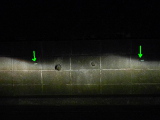 ロービームの光軸を確認する。 ずれている場合、ヘッドライト裏上部にある L←→R 、U←→D の六角ネジを回し調整する。 ちなみに、この U←→D のネジ、取り付けた状態では がアクセスできないため、再度ライトを取り外し調整、取り付けといった手順となる。 |