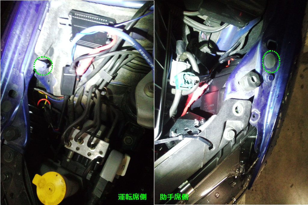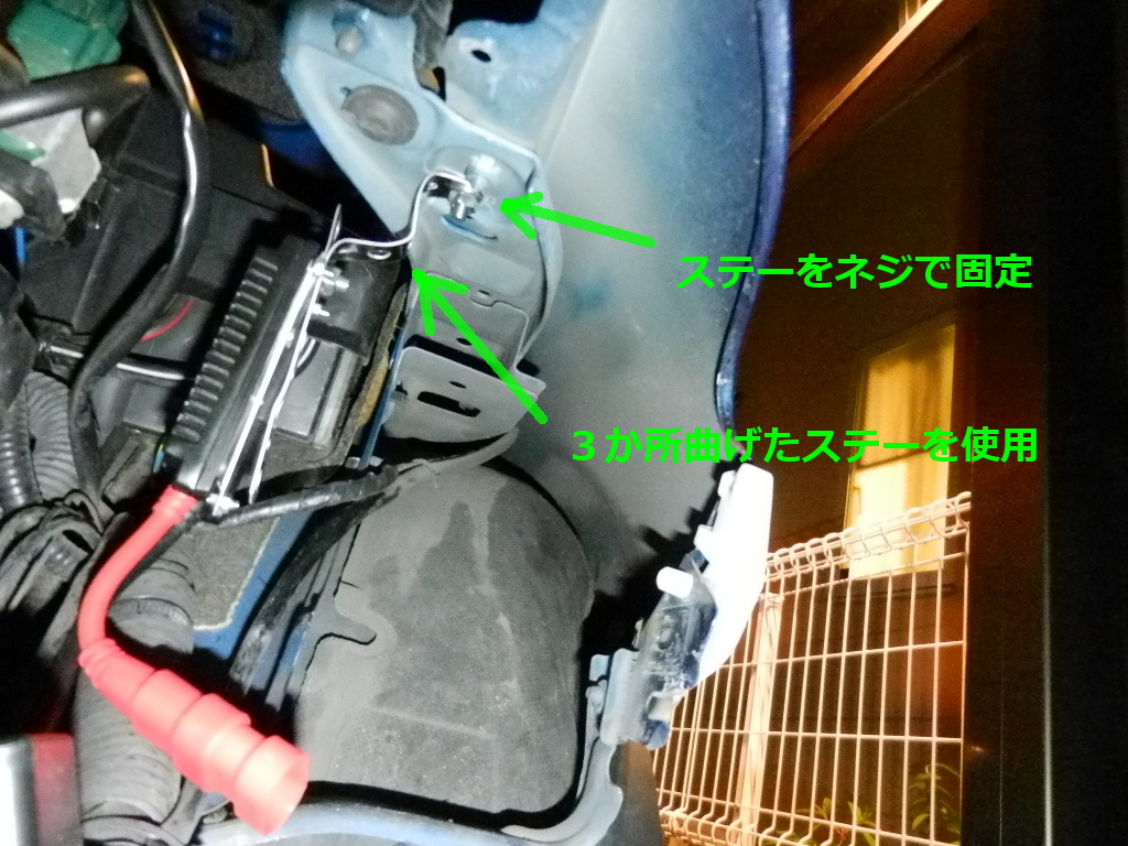 HIDのバラストを取り付ける。運転席側は未使用の穴があるため、そこに取り付ける。 助手席側はシールでふさいでいる穴があるため、シールをはがし、ステーを使用し、取り付ける。 |