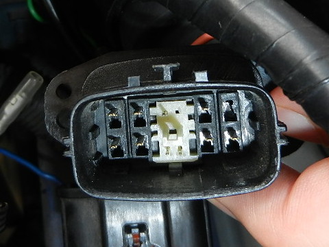加工したH3 LEDバルブをもともとついているハロゲンと交換する。写真は余計なギボシが入っている。 また、コード格納時は注意が必要。+12V側端子が裸になっている箇所がある。これが固定金具等に触れないように格納。 一応、点灯チェック。 |