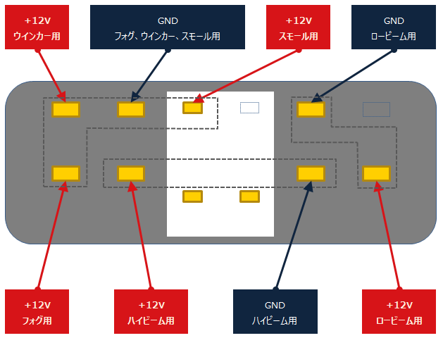 直接ヘッドライトコネクタに接続して確認だとフォグランプが4灯となり、おそらくヒューズが飛ぶ。 55W x 4灯 ÷ 12V = 18.3 A 、ヒューズは15A。(でも片目毎に確認なら可能かも) そこで、12V(5A以上)の電源を用意し、各ライトの点灯確認をする。 各ライトは下記ピンアサインでイカリングは赤と黒の裸線に+12VとGNDを接続し確認する。 他にデイライト用に青LEDとHIDキットを使用するため、これらにも同様に点灯確認をする。 |